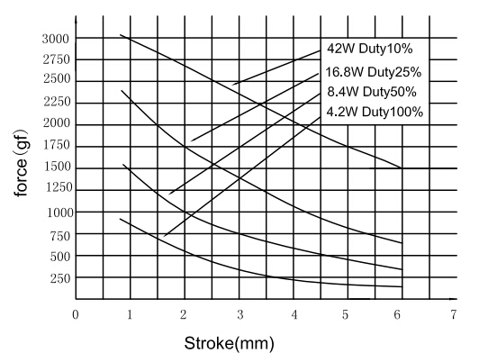 縱向:代表推拉式電磁鐵在對應行程時的力量   單位為克(g)